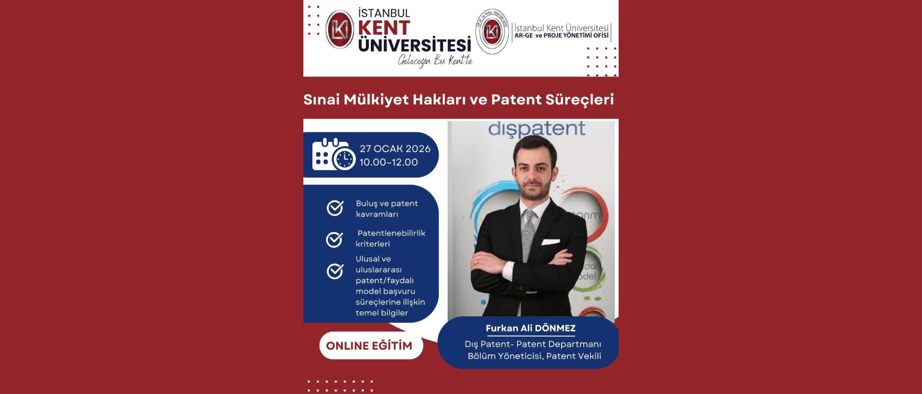 Üniversitemiz, sınai mülkiyet hakları ve patent süreçlerine ilişkin çalışmalar kapsamında çevrim içi patent eğitimi düzenlemiş olup, eğitim online ortamda gerçekleştirilmiştir.